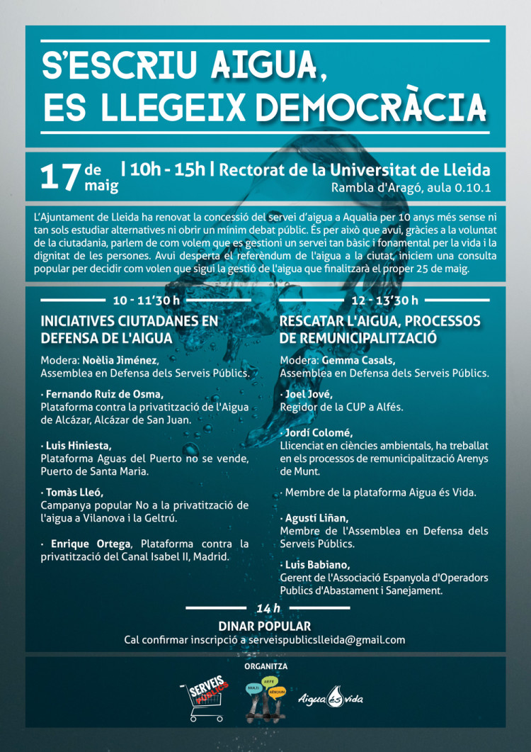 ConvocatòriesLleida 17 de Maig – Jornada Aigua i Democràcia a Lleida aiguaesvida 2014-05-06 06 maig 2014 aiguaesvida 1 0 2.2k 0 ¡¡Màxima difusió!! Etiquetes:AccionsAqualia FCCRemunicipalització