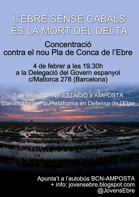 Amb aquest objectiu, us emplacem a que doneu suport al manifest i convocatòria de concentració que fem per al proper Dijous 4 de Febrer a les 19’30h davant a de la Delegació del Govern Espanyol, per demanar la derogació inmediata del Pla de Conca de l’Ebre.